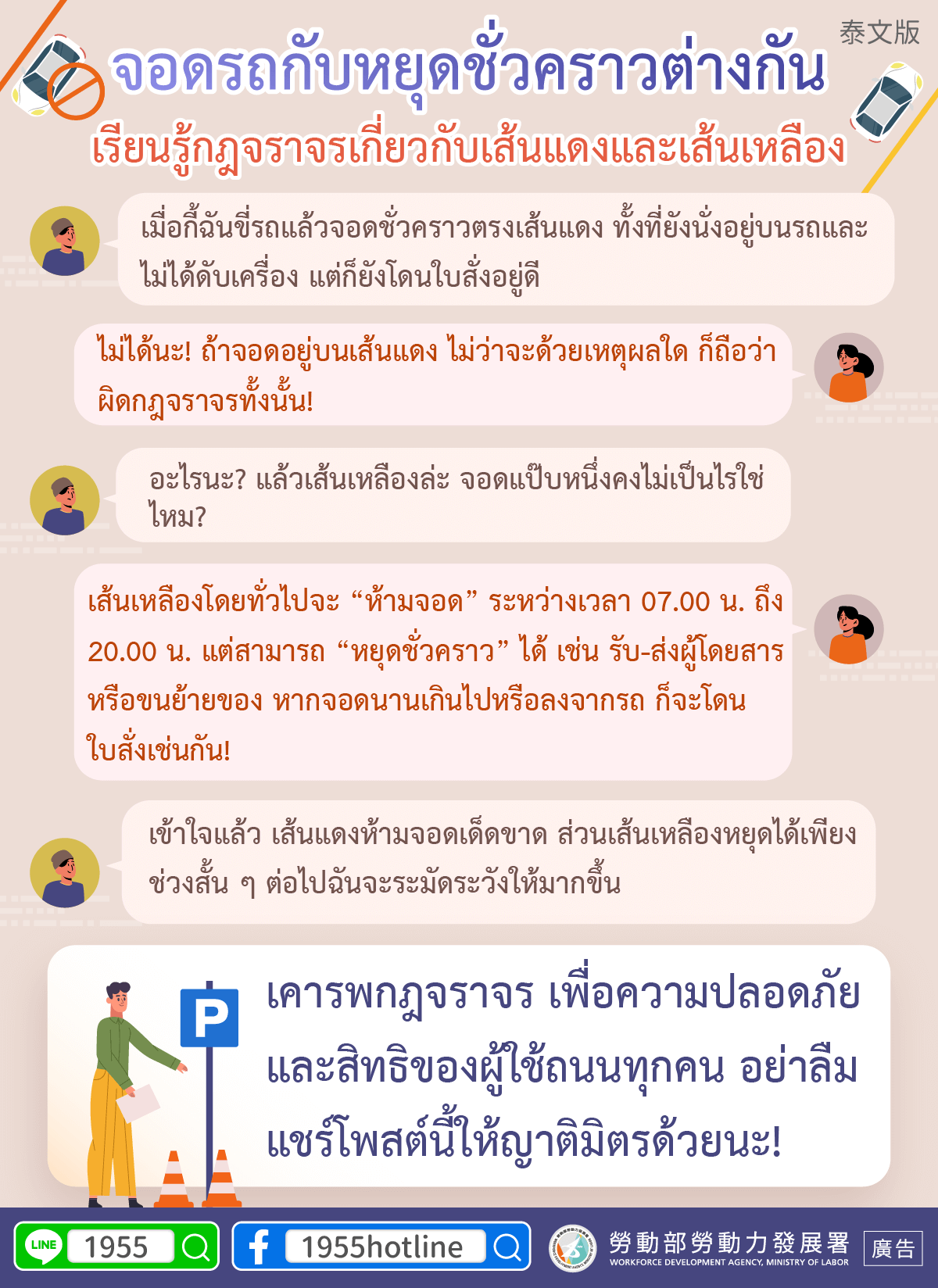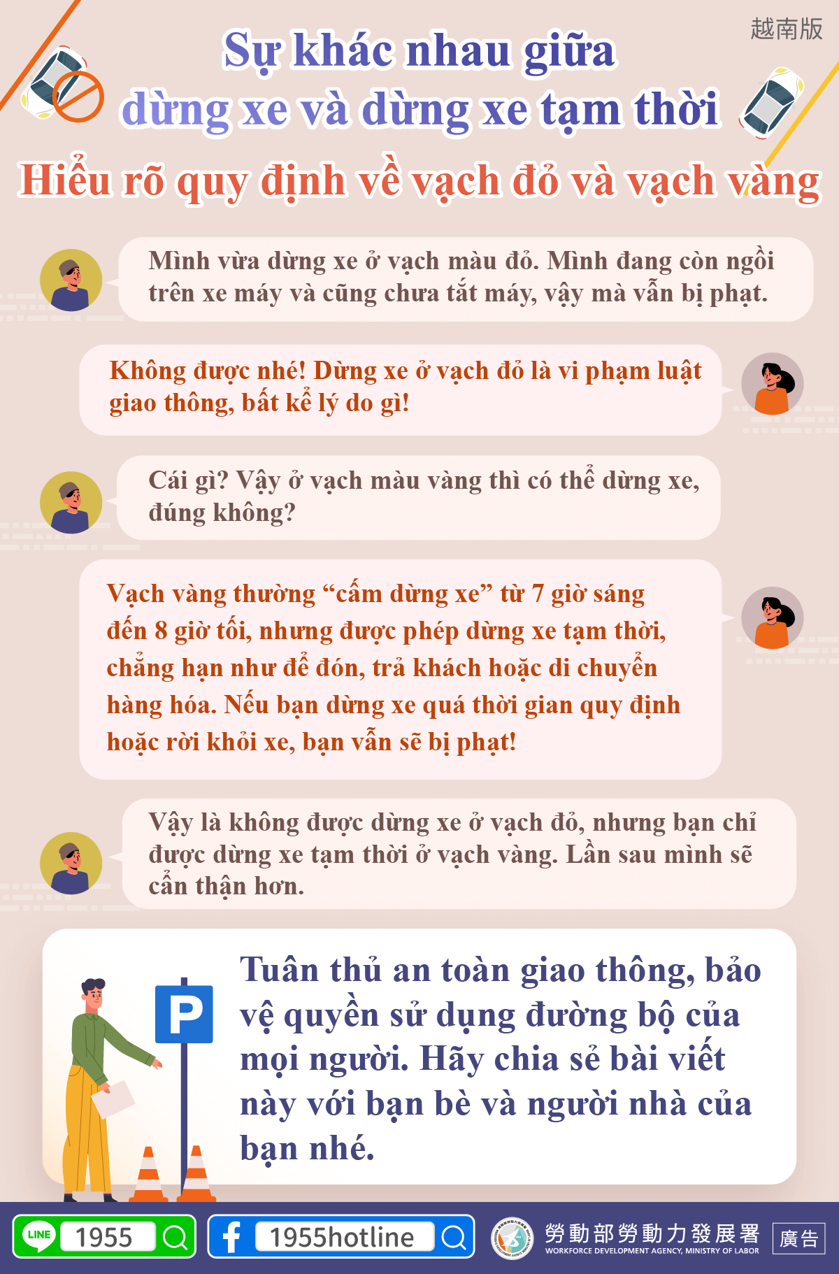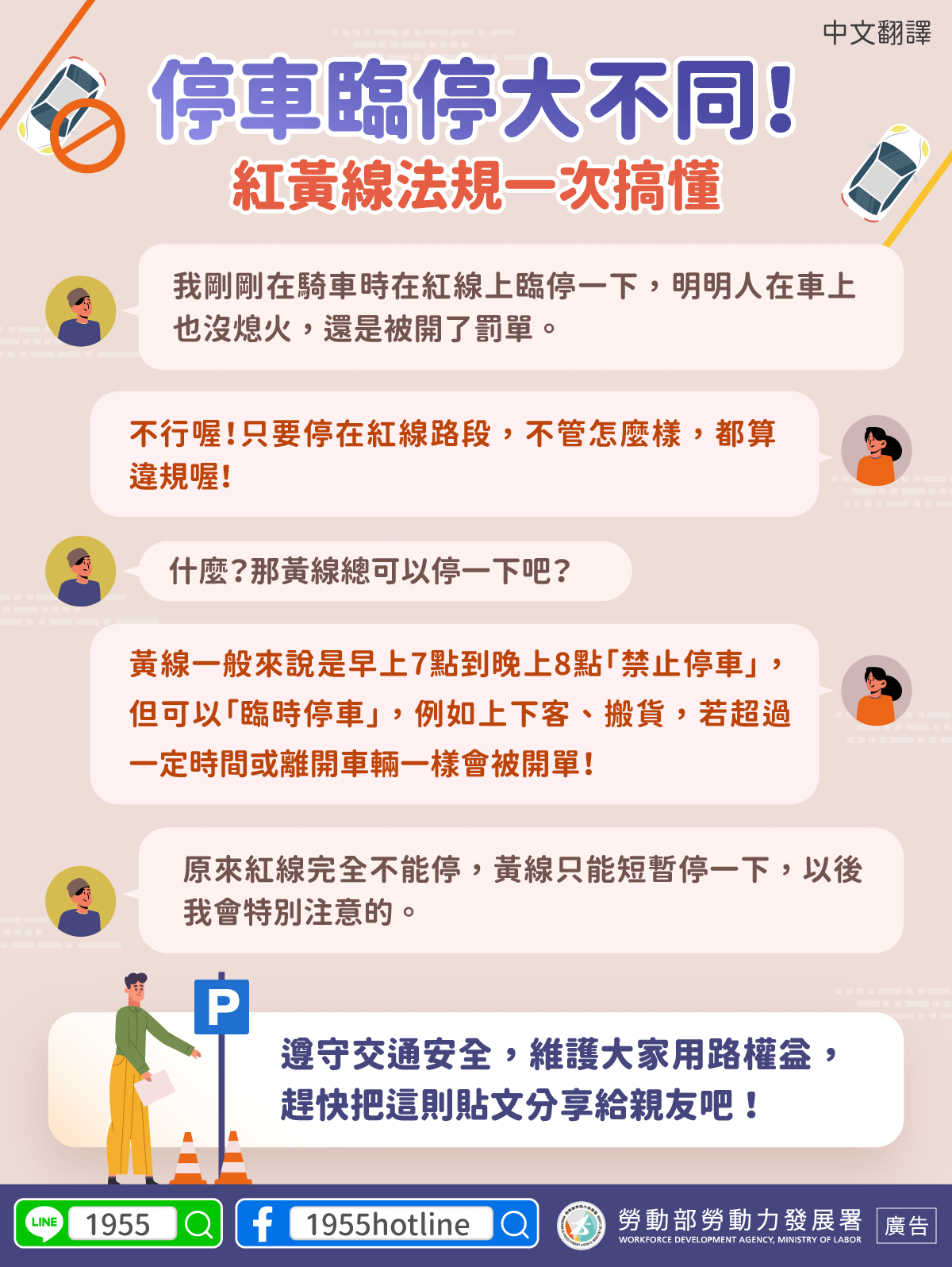 B:黃線一般來說是早上7點到晚上8點「禁止停車」,但可以「臨時停車」,例如上下客、搬貨,若超過一定時間或離開車輛一樣會被開單!