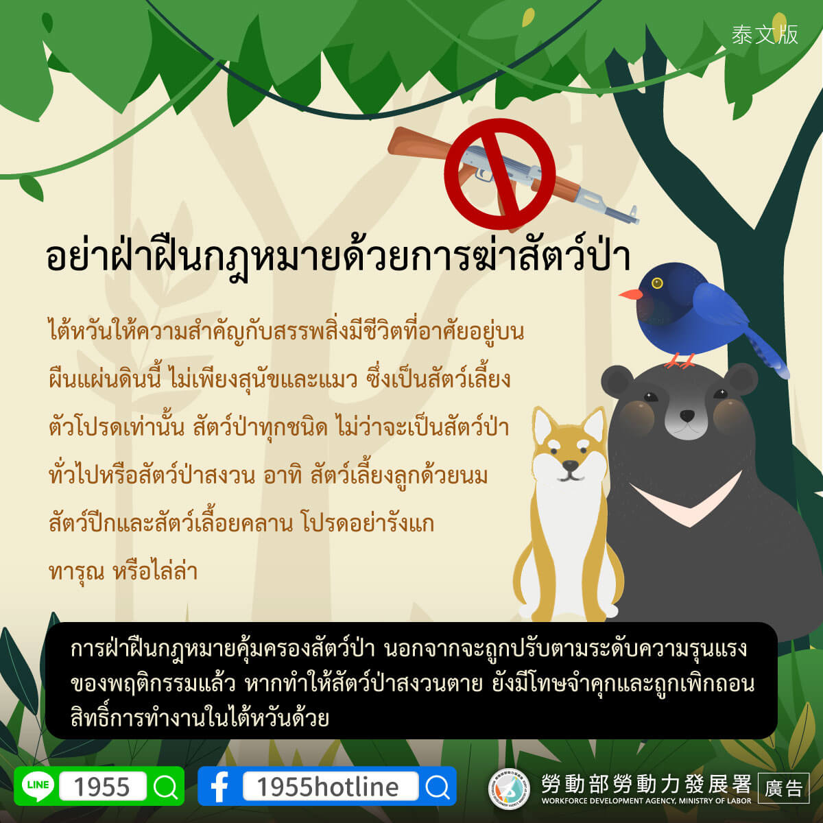 不只犬、貓等伴侶動物,臺灣尊重生活在這塊土地上的所有生物,請勿任意騷擾、虐待、獵捕哺乳類、鳥類、爬蟲類、兩棲類野生動物,無論其為一般或保育類動物。