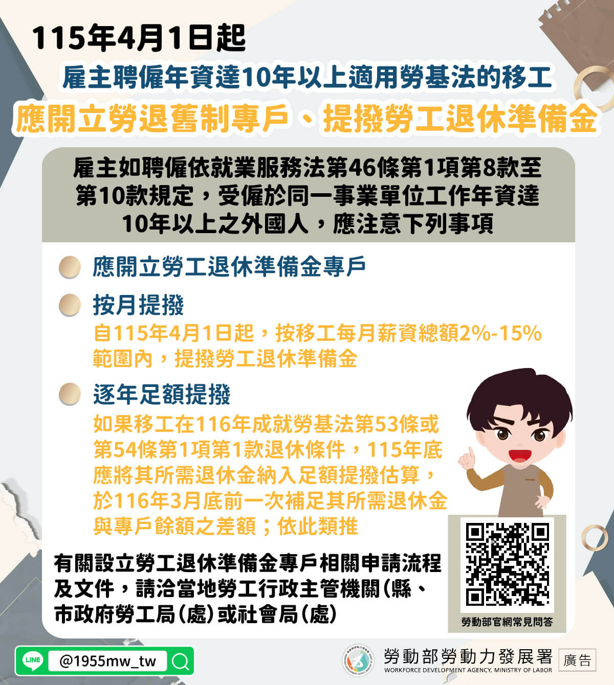 ▍115年4月1日起,雇主聘僱年資達10年以上適用勞基法的移工應開立勞退舊制專戶、提撥勞工退休準備金