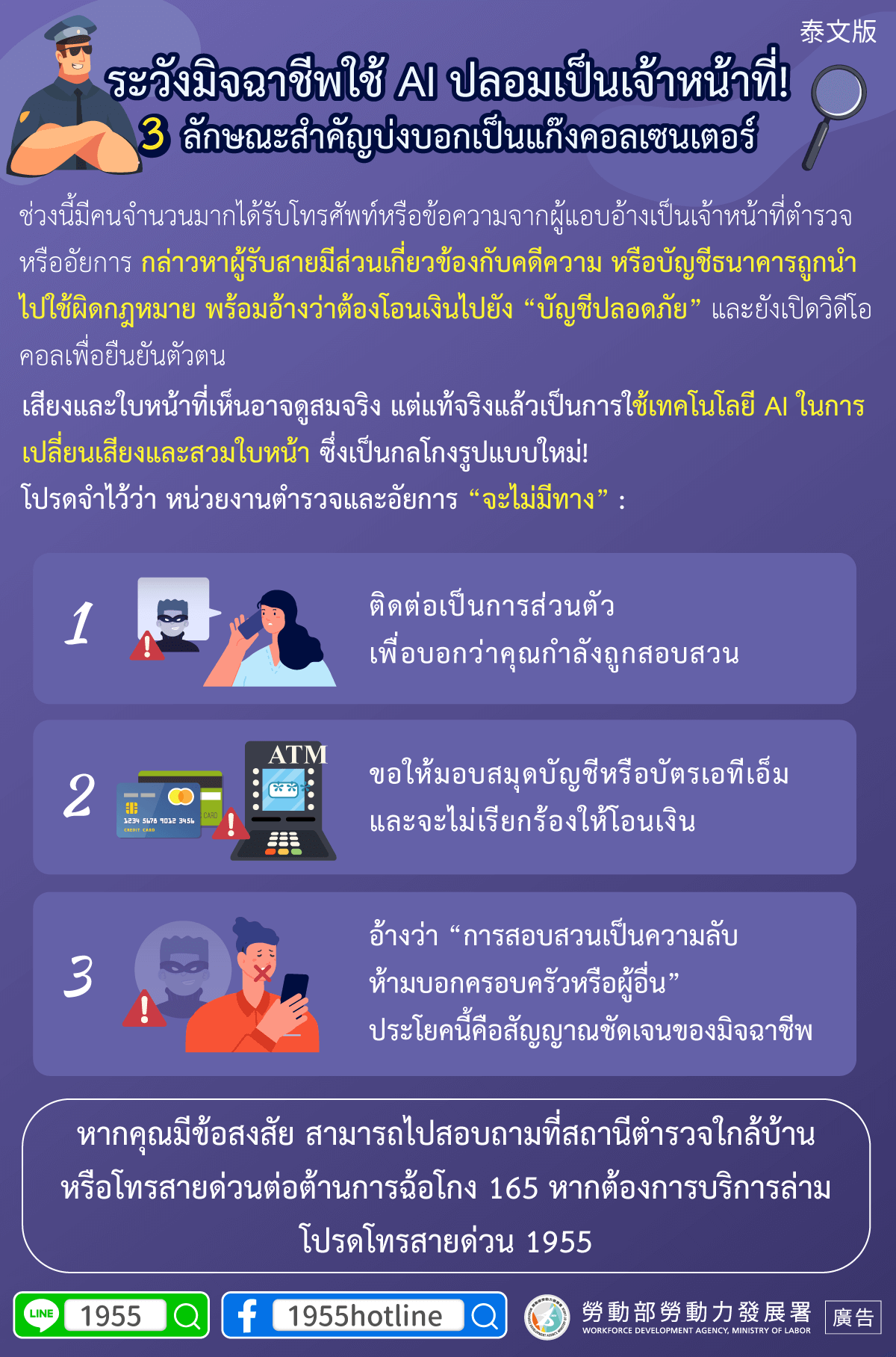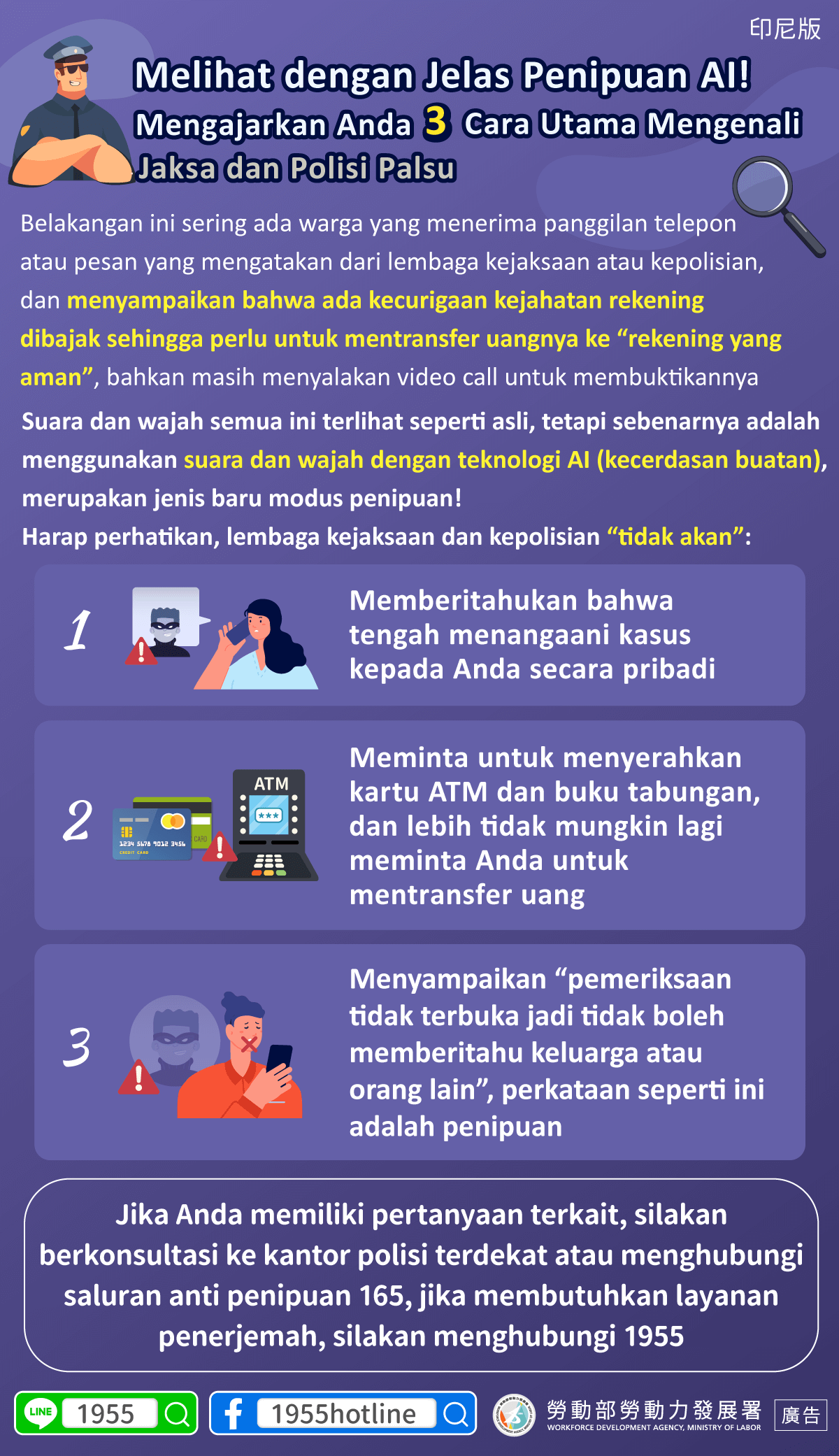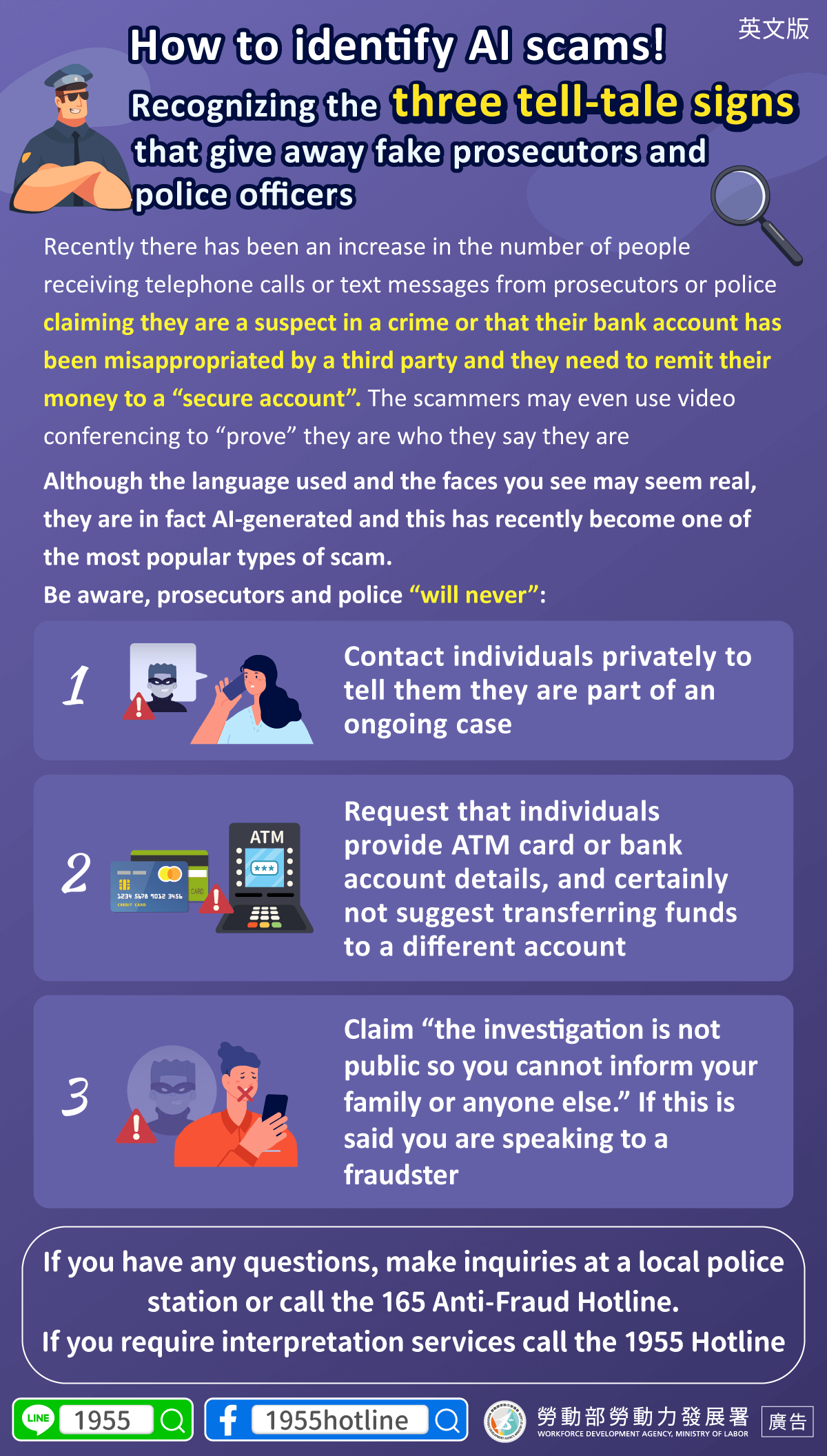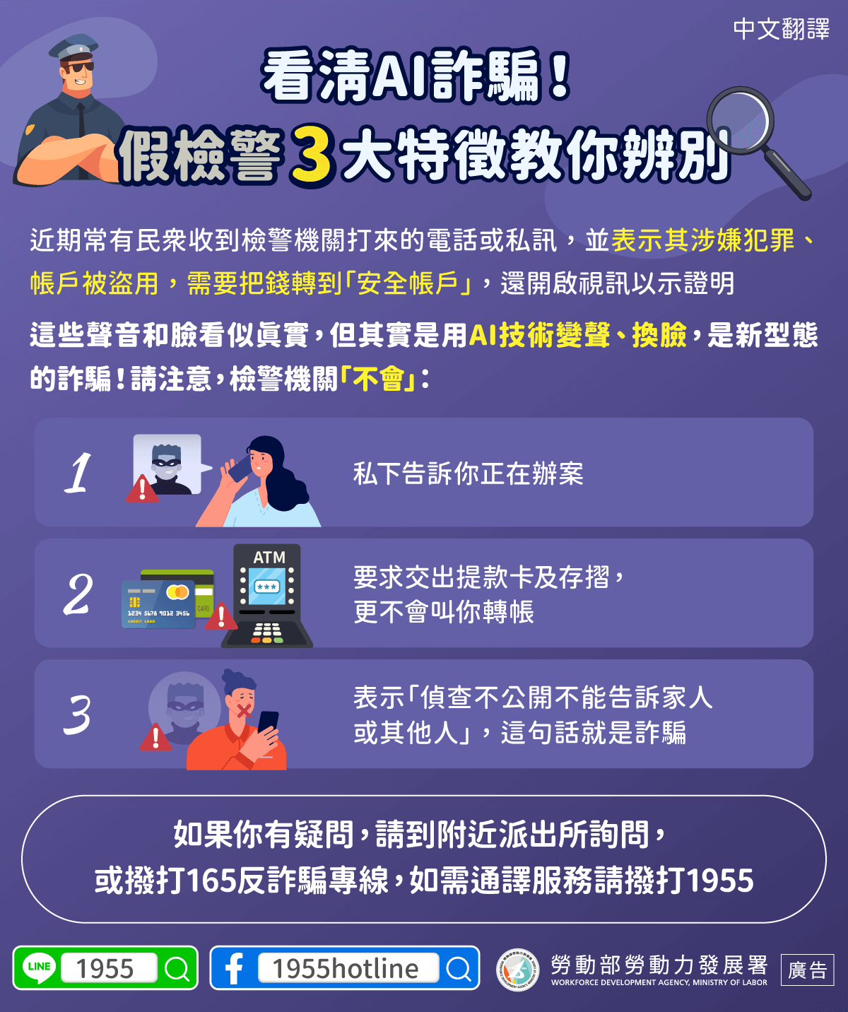如果你有疑問,請到附近派出所詢問,或撥打165反詐騙專線,如需通譯服務請撥打1955