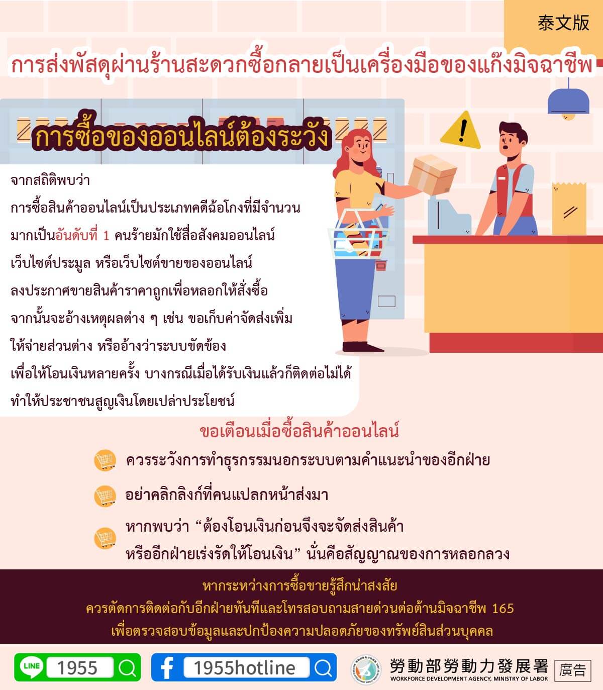 根據統計網路購物為詐騙案件數量的第1名,歹徒常透過社群平台、拍賣網站或不明購物網站刊登低價商品誘使下單,之後再以加收運費、補差額或系統錯誤為由要求多次付款,甚至收款後立即失聯,讓民眾血本無歸
