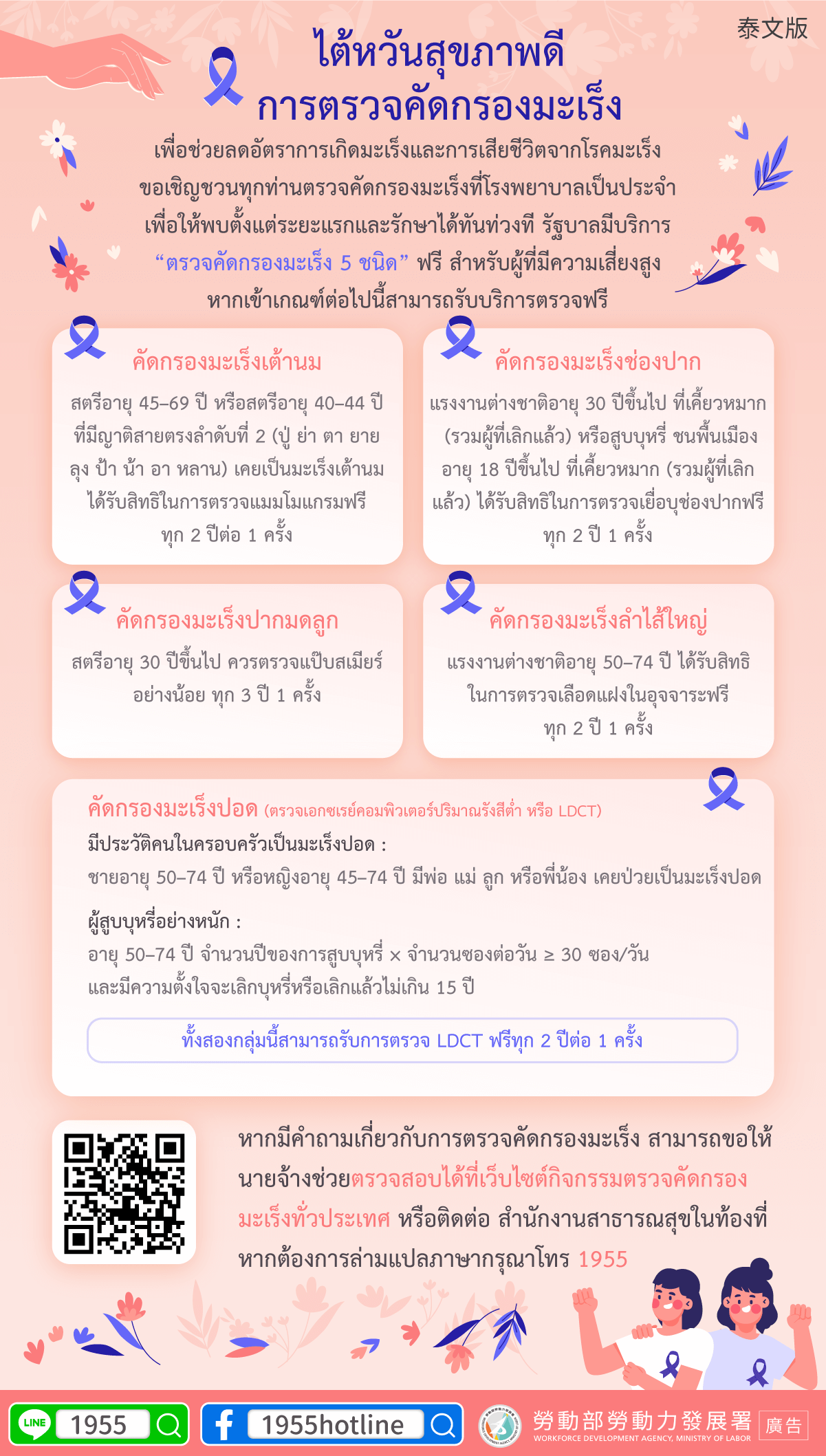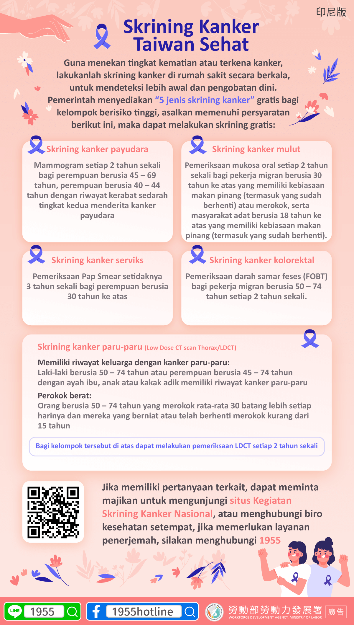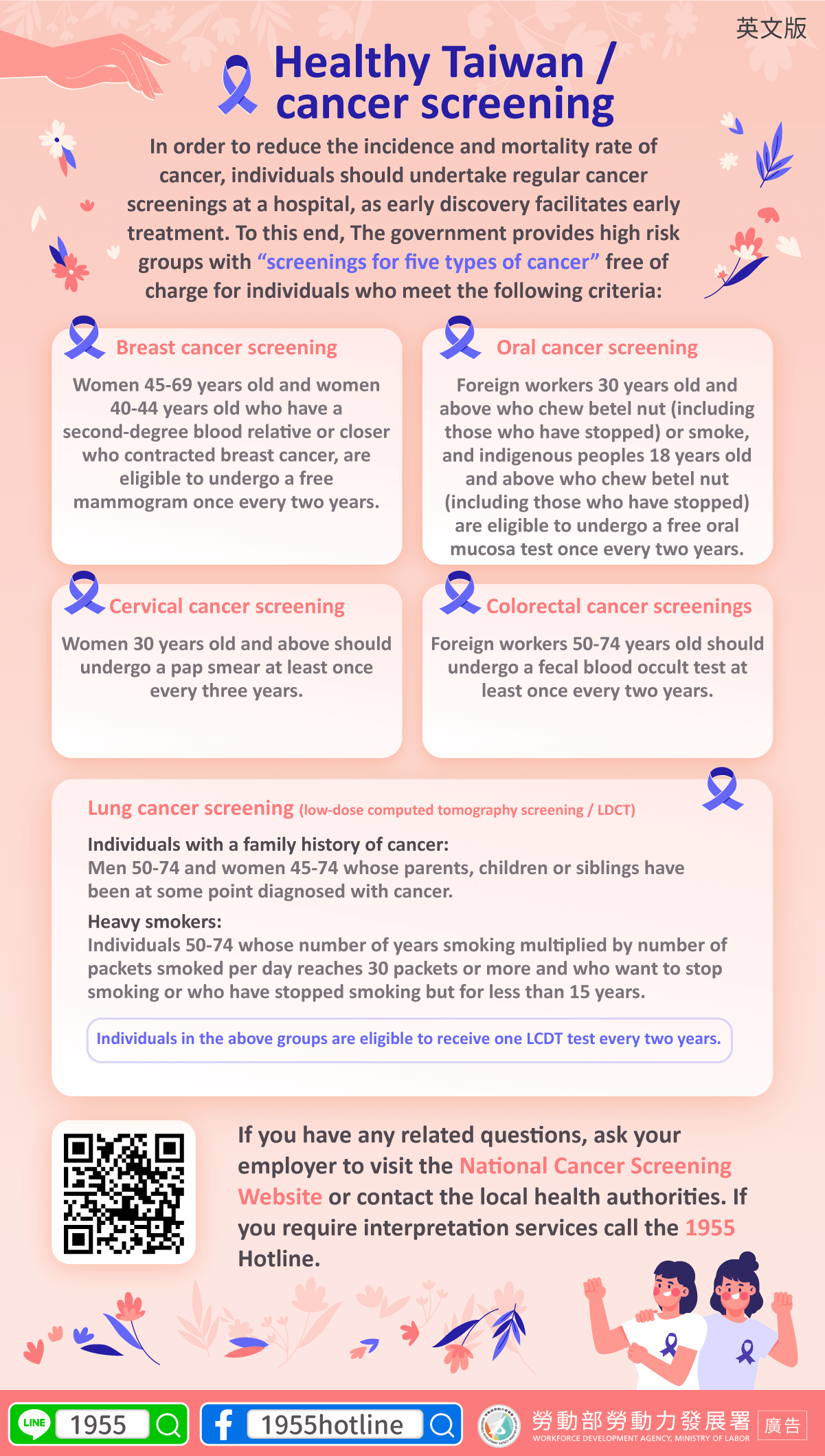 如有相關疑問,可請雇主至全國癌症篩檢活動網站查詢,或洽當地衛生局,如需通譯服務請撥打1955