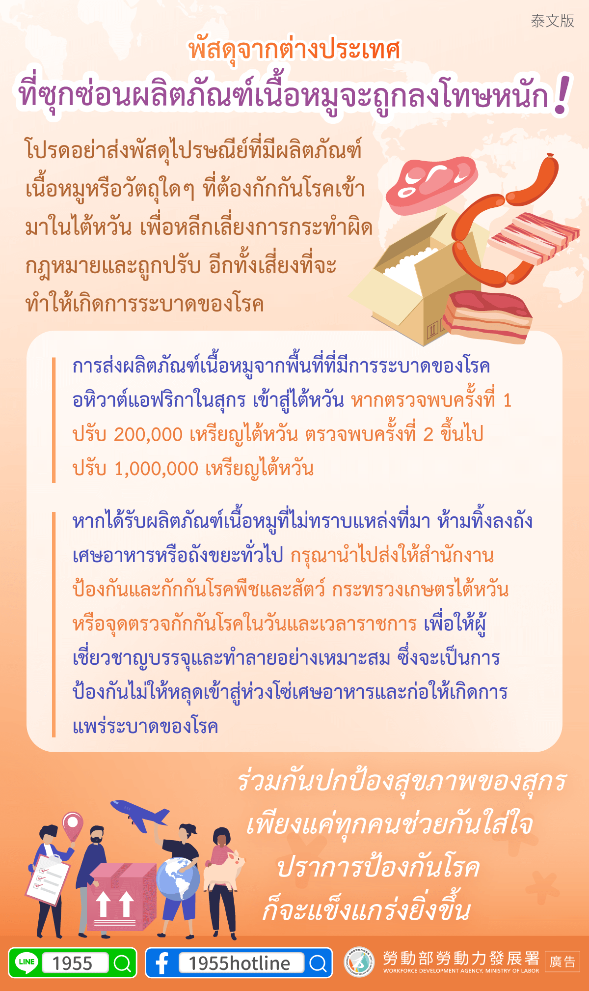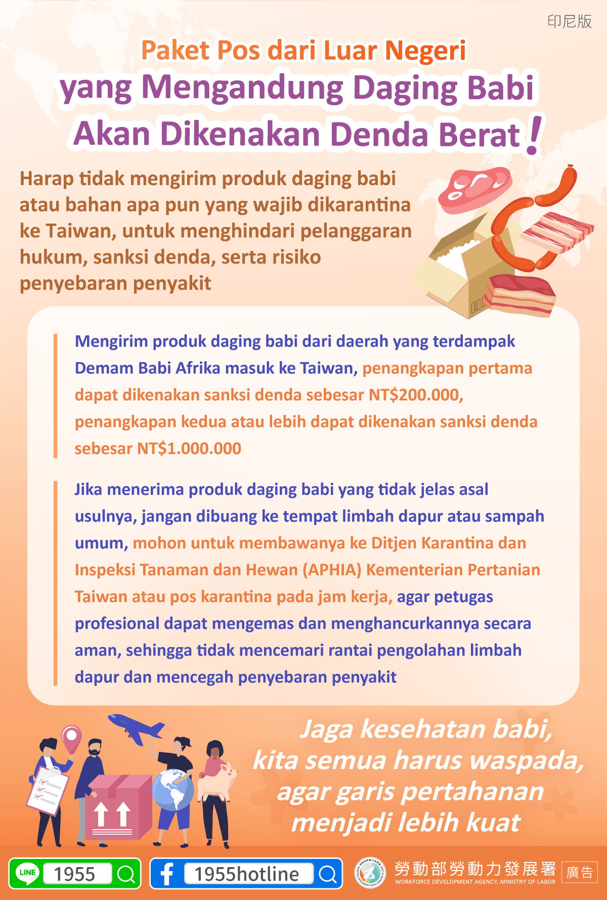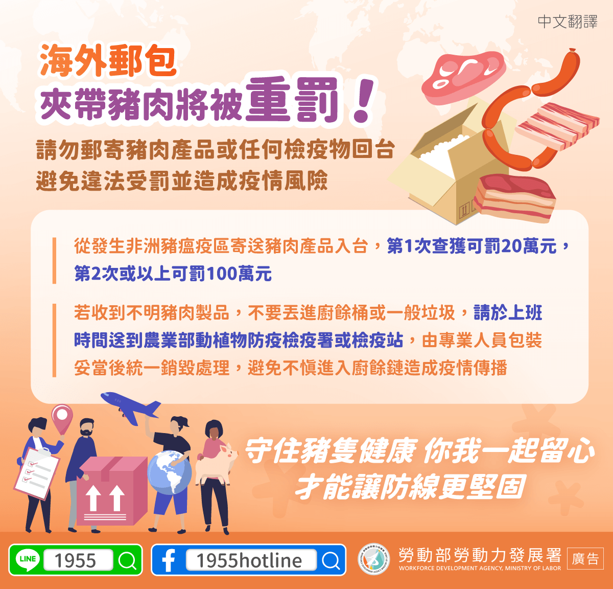 請勿郵寄豬肉產品或任何檢疫物回台,避免違法受罰並造成疫情風險