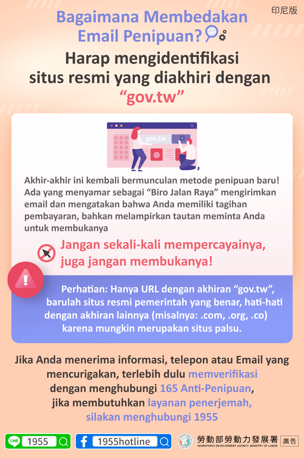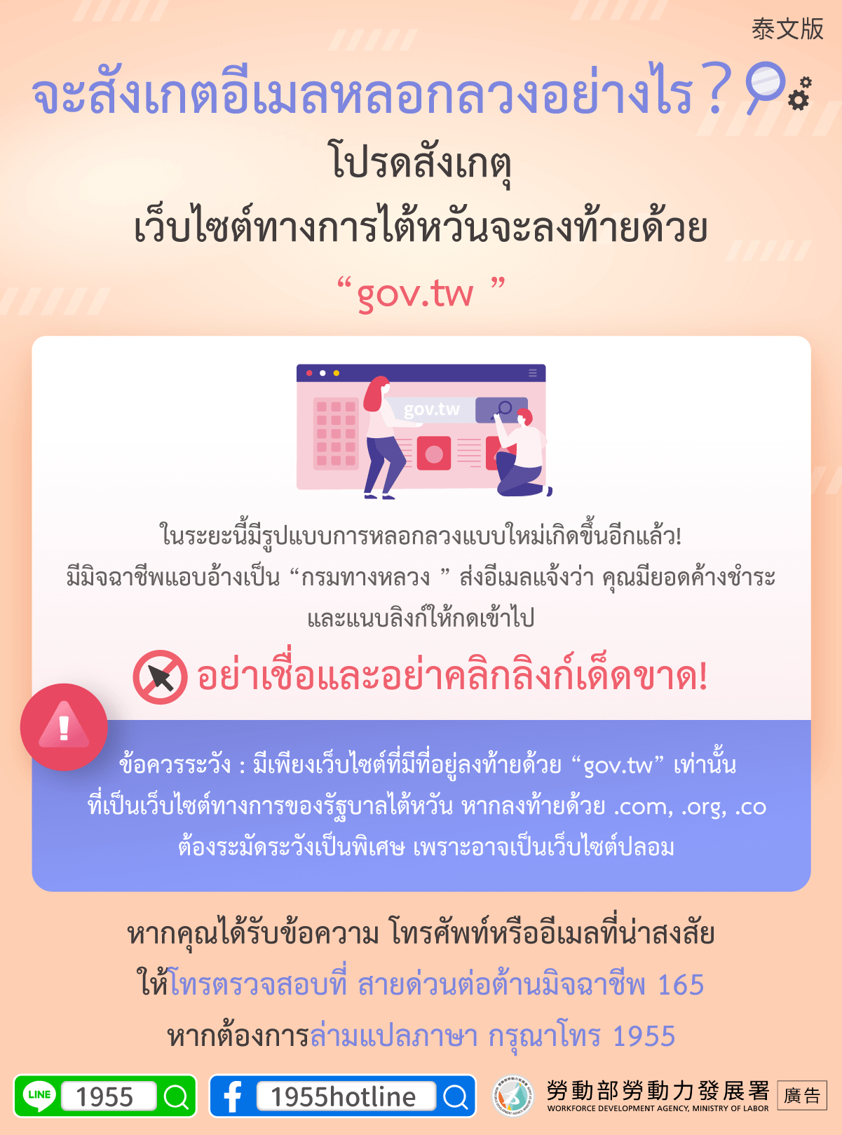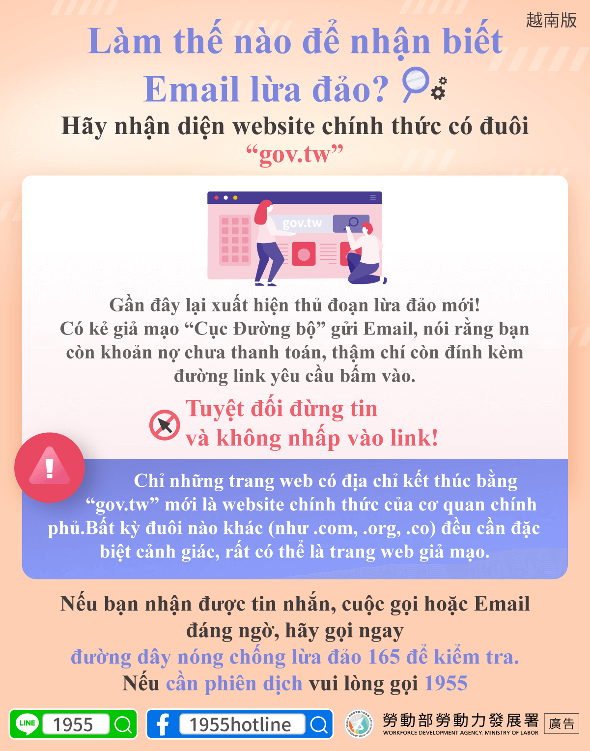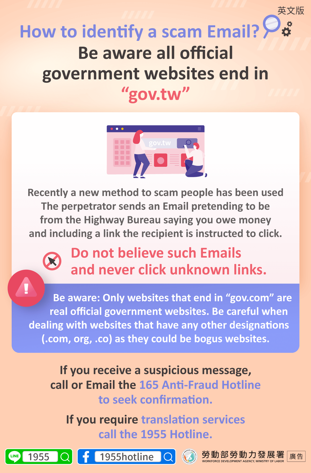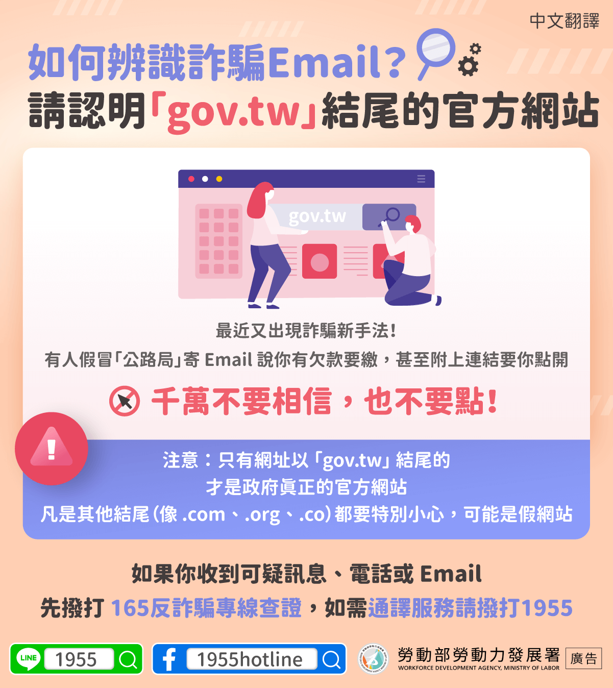 先撥打 165反詐騙專線查證,如需通譯服務請撥打1955