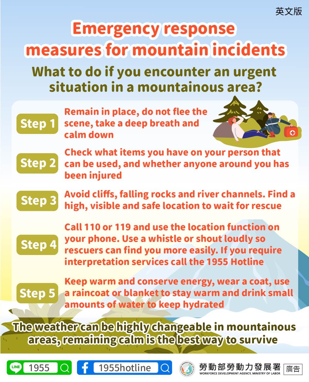 步驟4:撥打110、119並使用手機定位功能,可用哨子或大聲呼喊讓救援隊更容易找到你,如有通譯需求請撥打1955