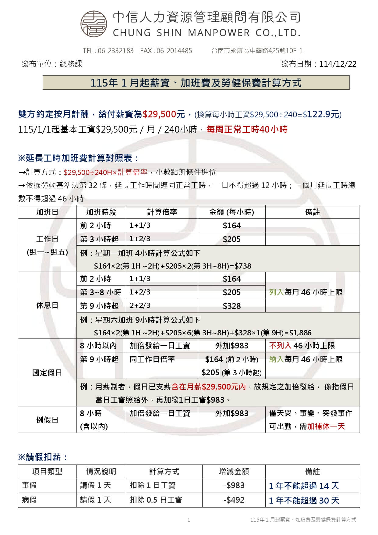 115年1月起薪資、加班費及勞健保計算方式